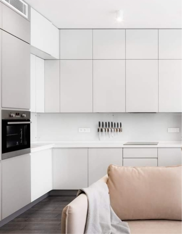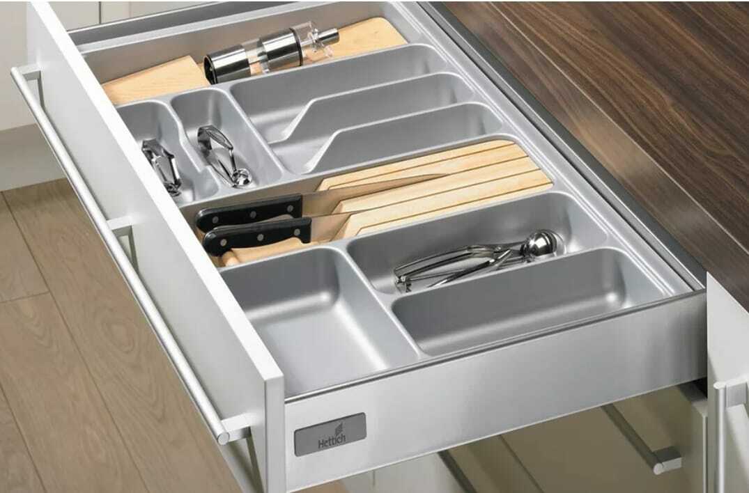 Скрытая система навески шкафов. Такая система выглядит намного эстетичнее, т.к. внутри шкафа нет пластиковых коробок.