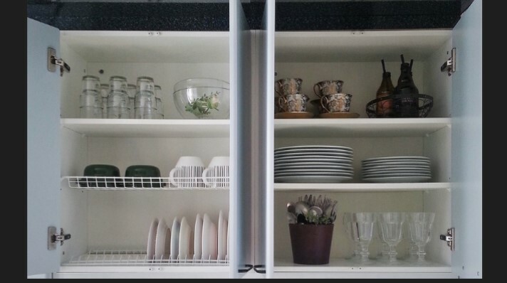 Полки в наших кухнях жёстко закреплены скрытыми полкодержателями и никогда не упадут. Как опция, есть жёсткие полкодержатели, но с возможностью переставления полок.